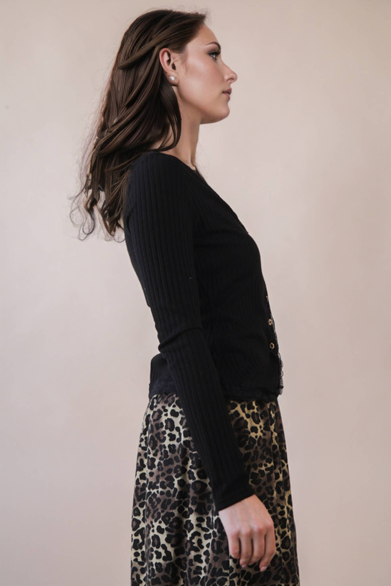 Button Down Lace Trim Fitted Knit Top