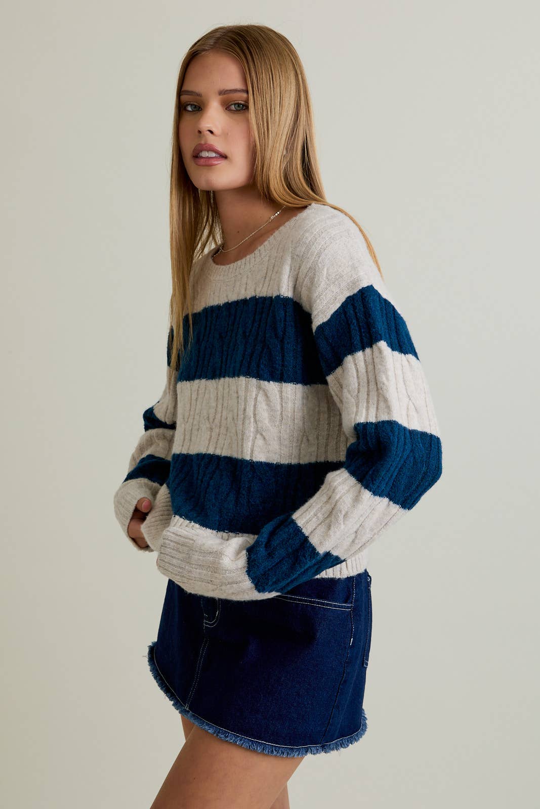Striped Round Neck Cable Sweater